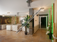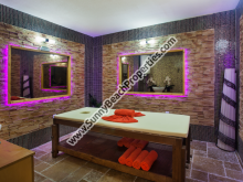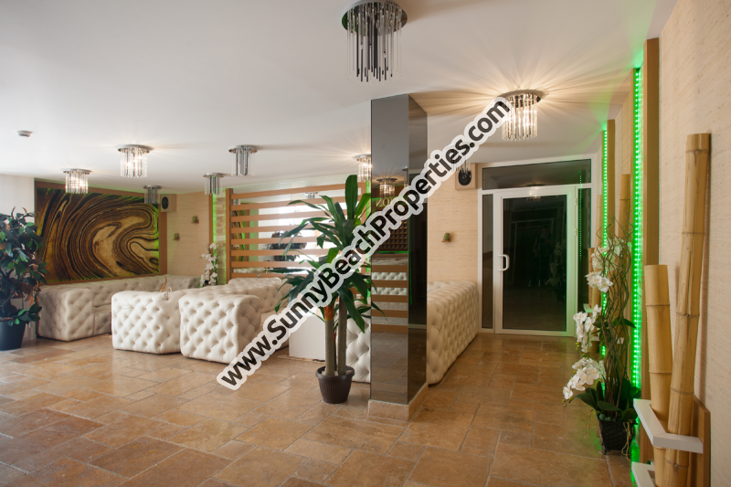• Рецепция: Пол – природный камень травертин; красивое светодиодное RGB осветление; стены с естественными бамбуковыми обоями и природным камнем травертин.